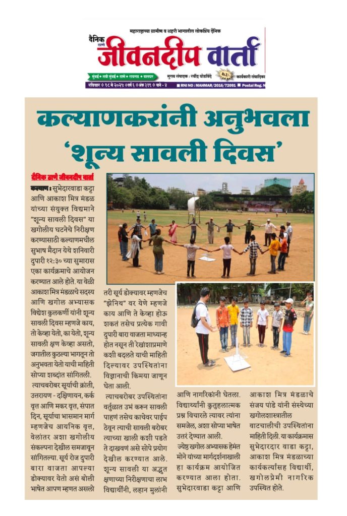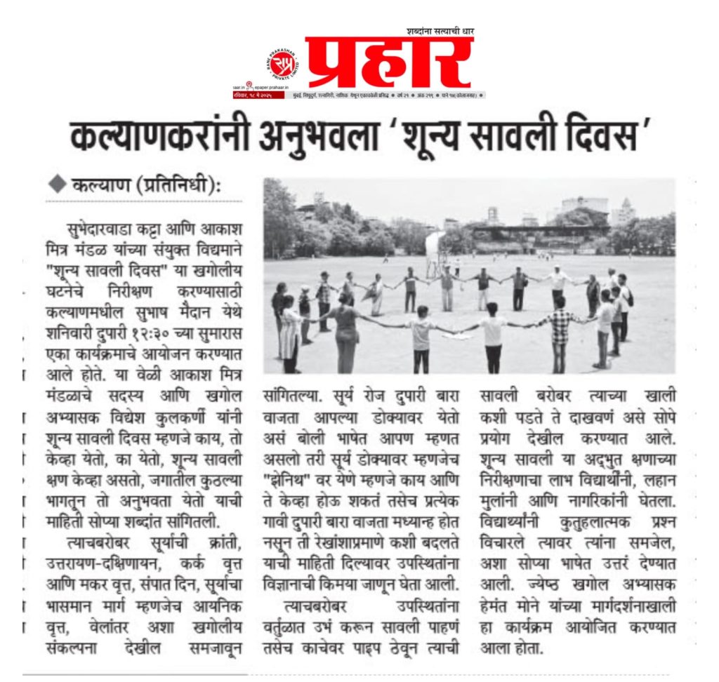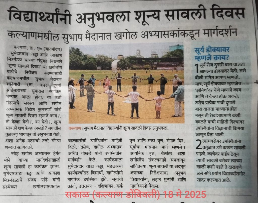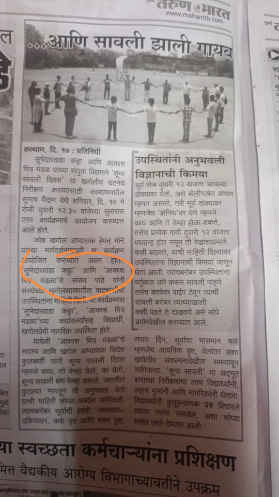 सुभेदार कट्टा आणि आकाशमित्र मंडळ तर्फे कल्याण येथील सुभाष मैदानात शून्य सावली दिवस अनुभवला.